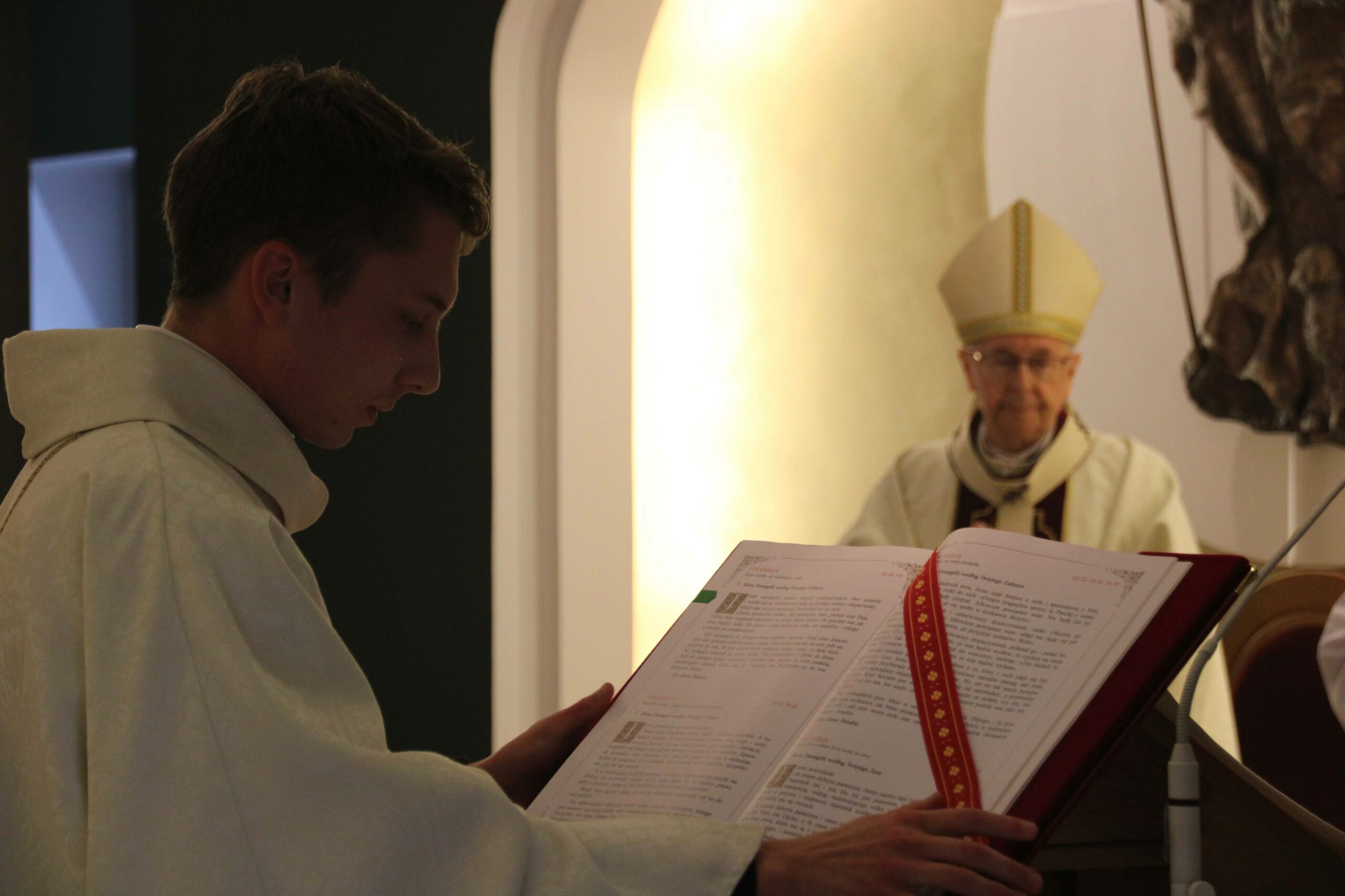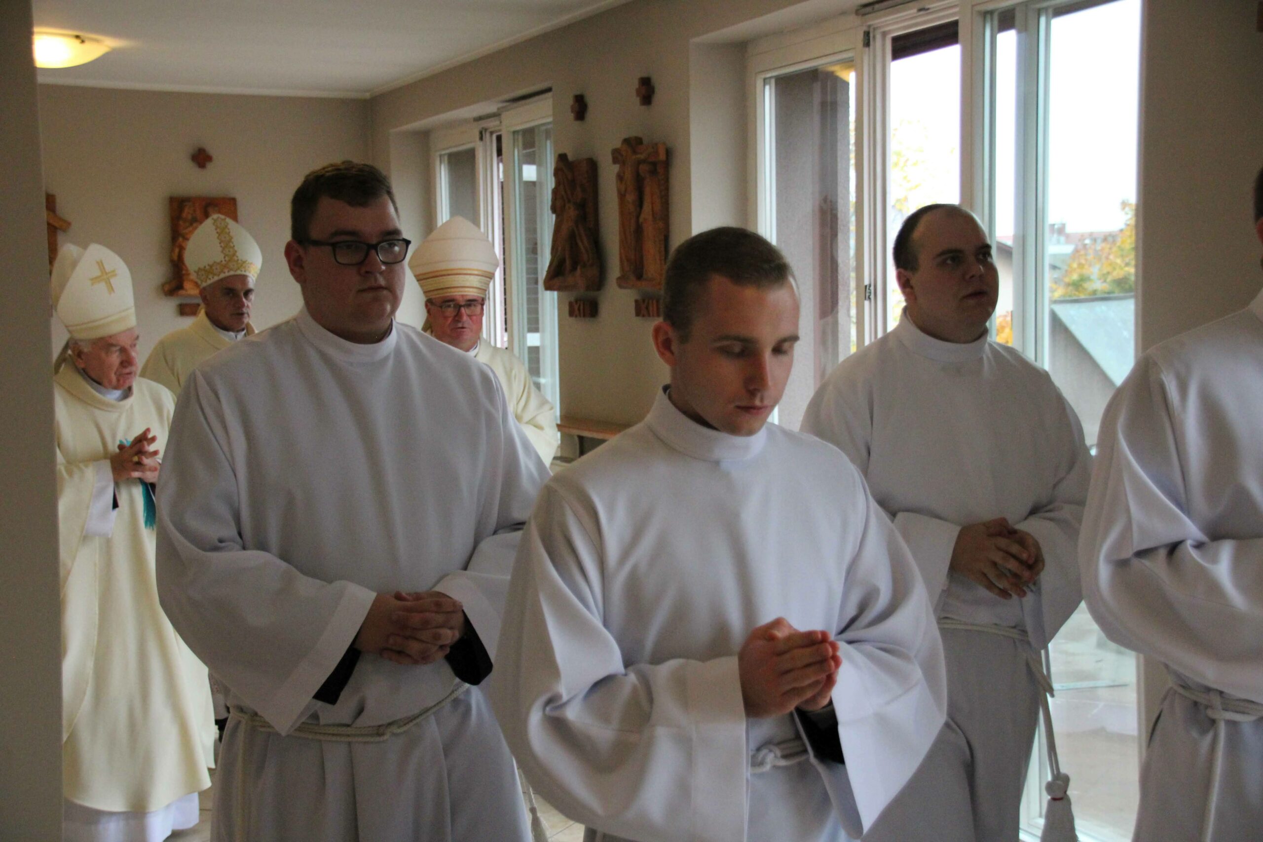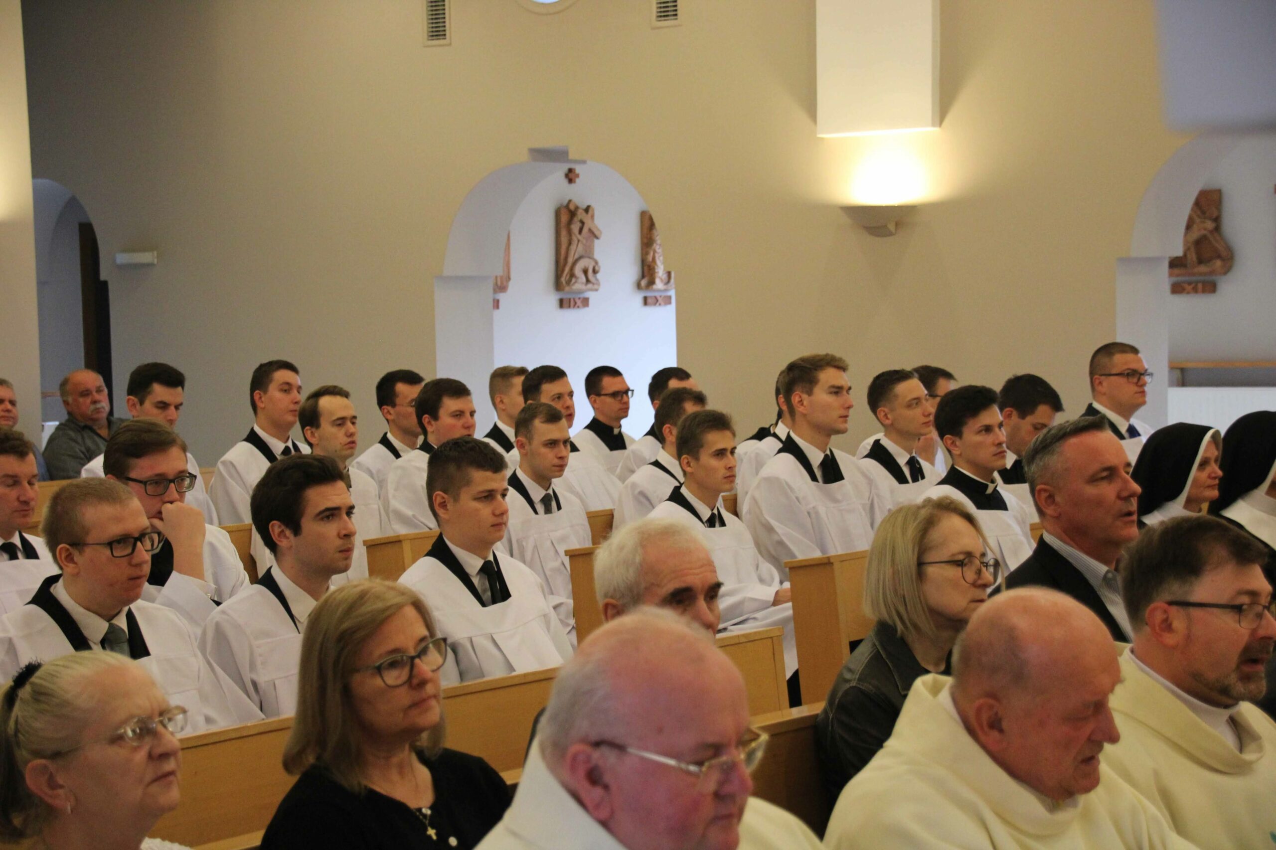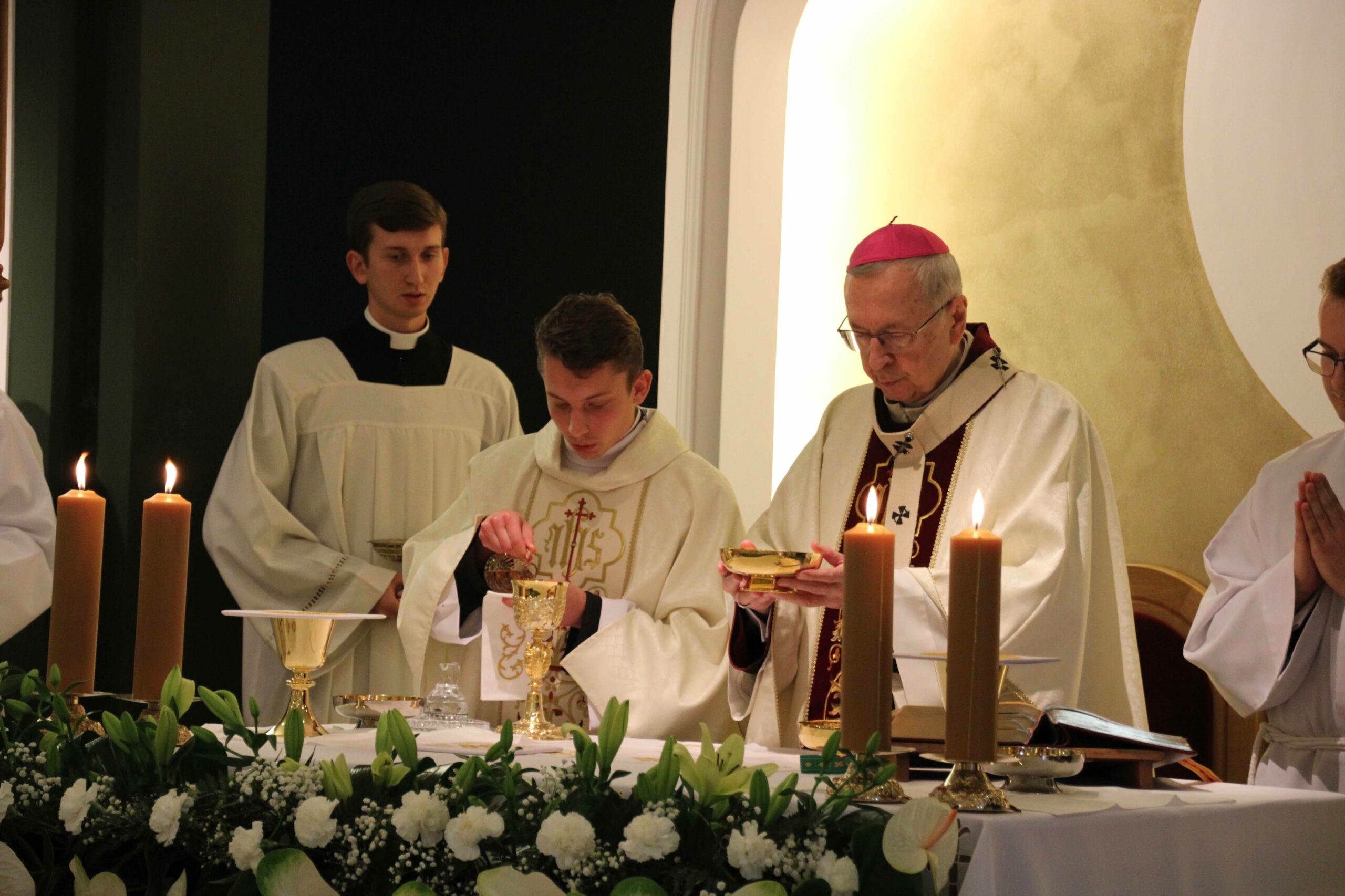 Wtorek był dla naszej wspólnoty dniem uroczystej inauguracji nowego roku formacyjnego. Eucharystii w kaplicy pw. Chrystusa Dobrego Pasterza przewodniczył arcybiskup metropolita poznański Stanisław Gądecki, a koncelebrowali biskup kaliski Damian Bryl, biskup bydgoski Krzysztof Włodarczyk, poznańscy biskupi pomocniczy Grzegorz Balcerek i Szymon Stułkowski, biskup senior Zdzisław Fortuniak, księża przełożeni oraz przełożeni innych seminariów, profesorowie, dziekan oraz wykładowcy Wydziału Teologicznego UAM, kanonicy Kapituły Metropolitalnej, proboszczowie kleryków roku propedeutycznego i inni zaproszeni księża. Oprócz kleryków we Mszy uczestniczyli również goście-przyjaciele naszego Seminarium z pozostałych poznańskich Uniwersytetów, Policji, Towarzystwa Przyjaciół ASD, a także nasi psychoterapeuci, prowadzący warsztaty interpersonalne w pierwszych latach formacji. Śpiewem towarzyszyła nam schola seminaryjna „Inclina aurem” pod batutą ks. prof. Mariusza Białkowskiego. Homilię wygłosił biskup bydgoski, wskazując na istotność trwania we wspólnocie Kościoła, jeśli nazywamy się osobami wierzącymi. Podkreślał przy tym, że Kościół przeżywa obecnie kryzys, potrzebuje więc słusznej krytyki, ale też miłości. Wspominając raporty synodalne zaakcentował także konieczność zaangażowania się świeckich, szczególnie kobiet, w działalność Kościoła, zwłaszcza w proces przekazywania wiary, który w relacji rodzic–dziecko jest w dzisiejszym świecie bardzo często zaburzony lub go nie ma wcale.