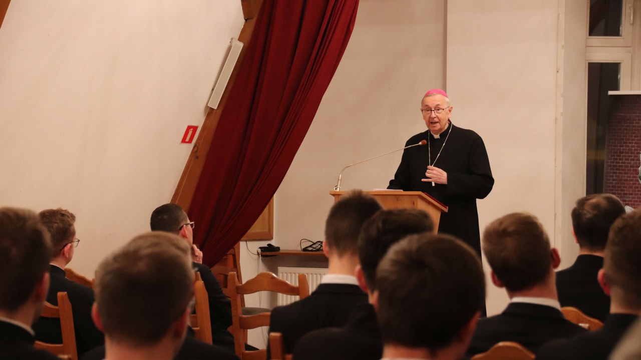 W środowy wieczór cała seminaryjna wspólnota spotkała się z gospodarzem naszego Domu – arcybiskupem metropolitą poznańskim Stanisławem Gądeckim. Ksiądz arcybiskup podzielił się z nami swoją refleksją dotyczącą Ewangelii z dnia, w której Jezus Chrystus zapowiada prześladowania swoich wyznawców (Łk 21, 12-19). Wspominał przy tym o różnych aspektach formacji w Seminarium, która powinna przygotowywać alumnów do ofiarnej posługi duszpasterskiej w czasach wymagających żywego świadectwa i bycia gotowym na największe poświęcenie. Po zakończonym wykładzie każdy z kleryków miał możliwość zadawania pytań metropolicie poznańskiemu.