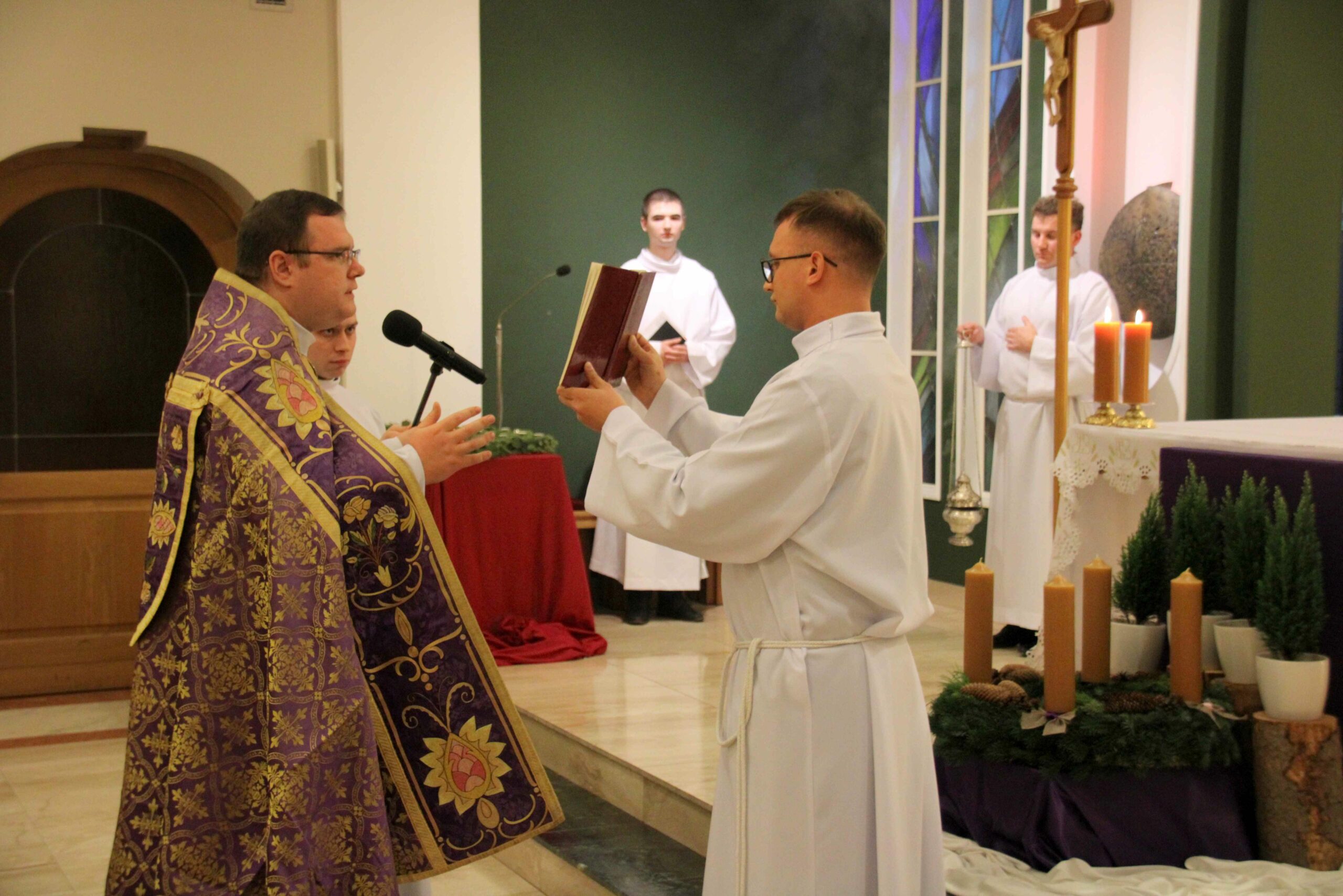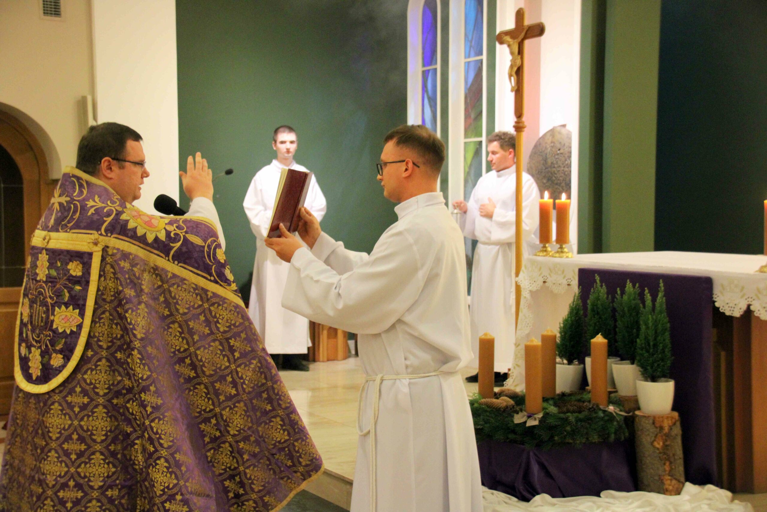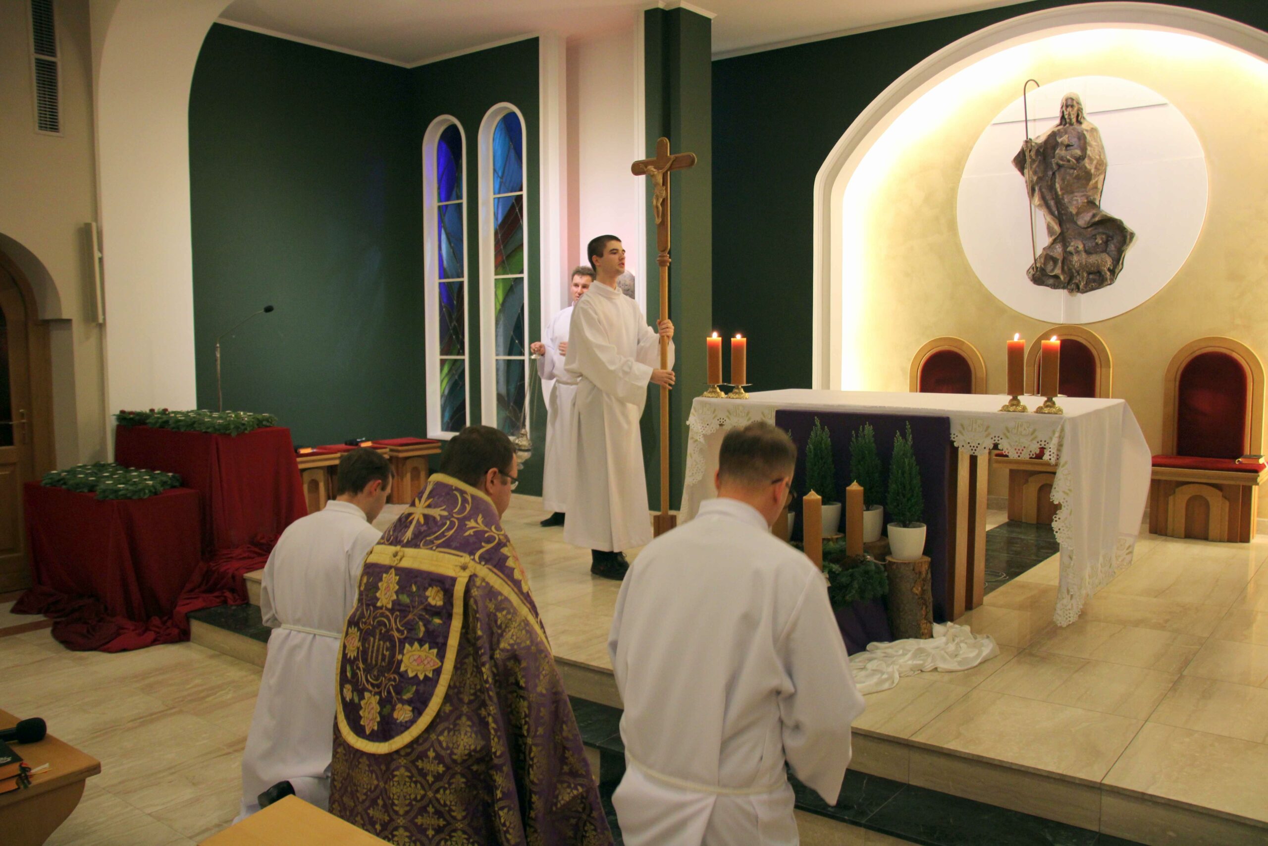Pierwszymi adwentowymi Nieszporami rozpoczęliśmy nowy rok liturgiczny i duszpasterski 2024/2025, który w Kościele powszechnym, w związku z Rokiem Jubileuszowym 2025, jest przeżywany pod hasłem „Pielgrzymi nadziei”. Wieczornej modlitwie Kościoła w kaplicy pw. Chrystusa Dobrego Pasterza przewodniczył i homilię wygłosił ojciec duchowny Łukasz Zawidzki. Przed rozpoczęciem brewiarzowej modlitwy ksiądz Łukasz poświęcił znajdujący się w kaplicy wieniec adwentowy oraz mniejsze wieńce, które otrzymali uczestnicy odbywających się w ten weekend dni skupienia, a także klerycy.