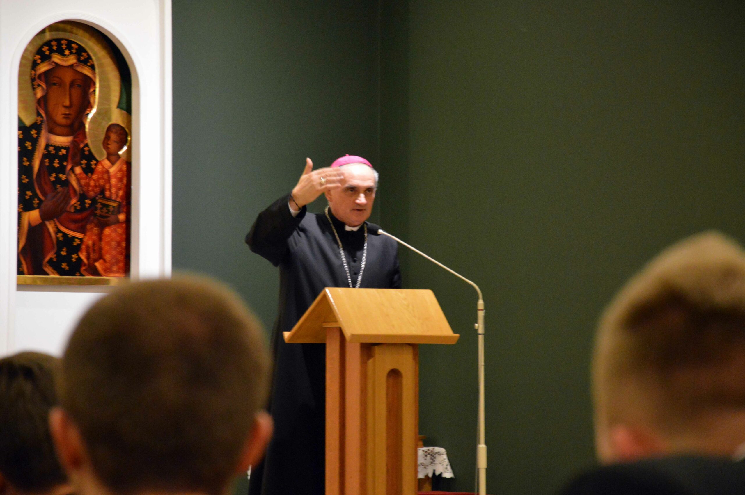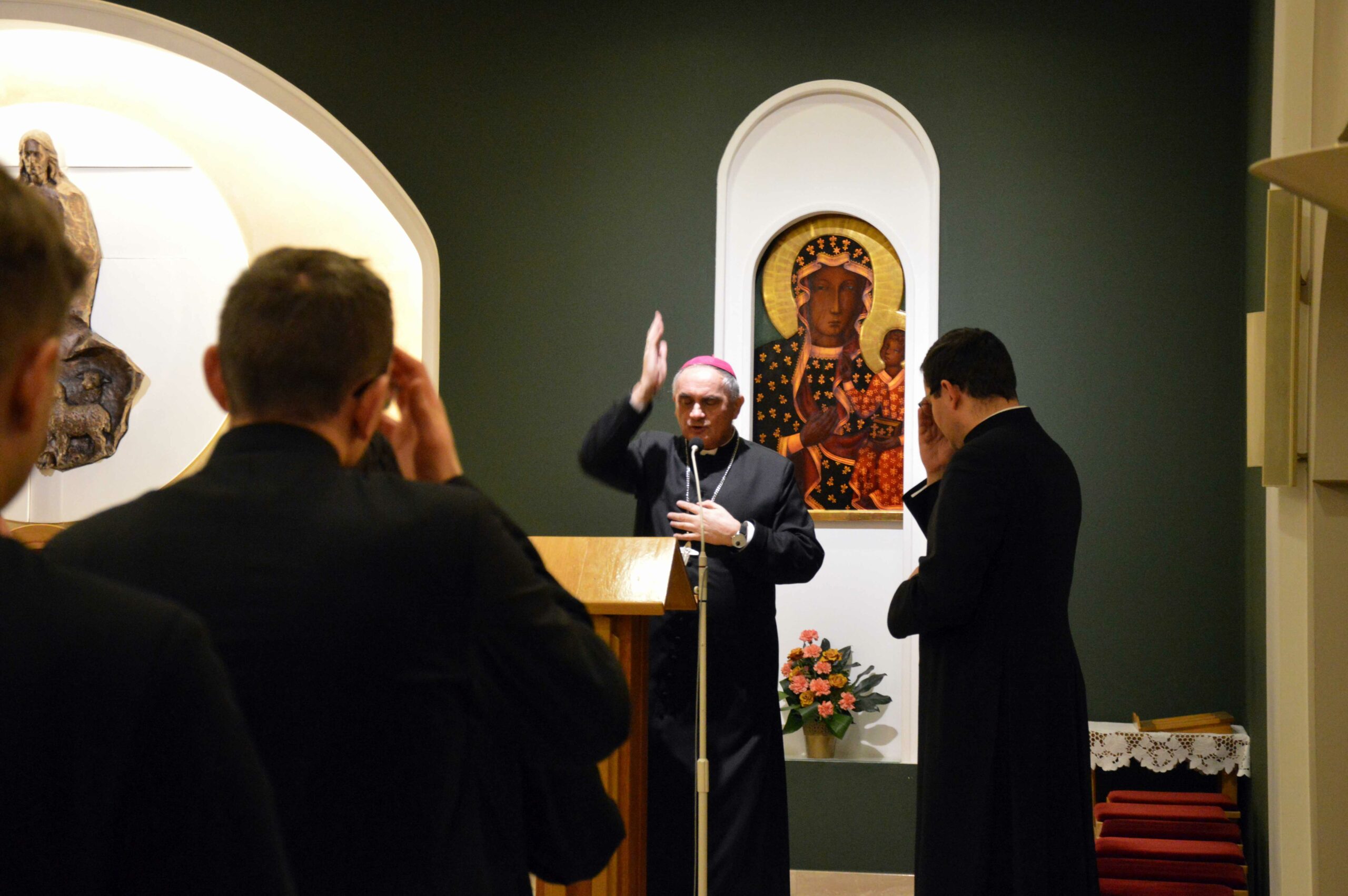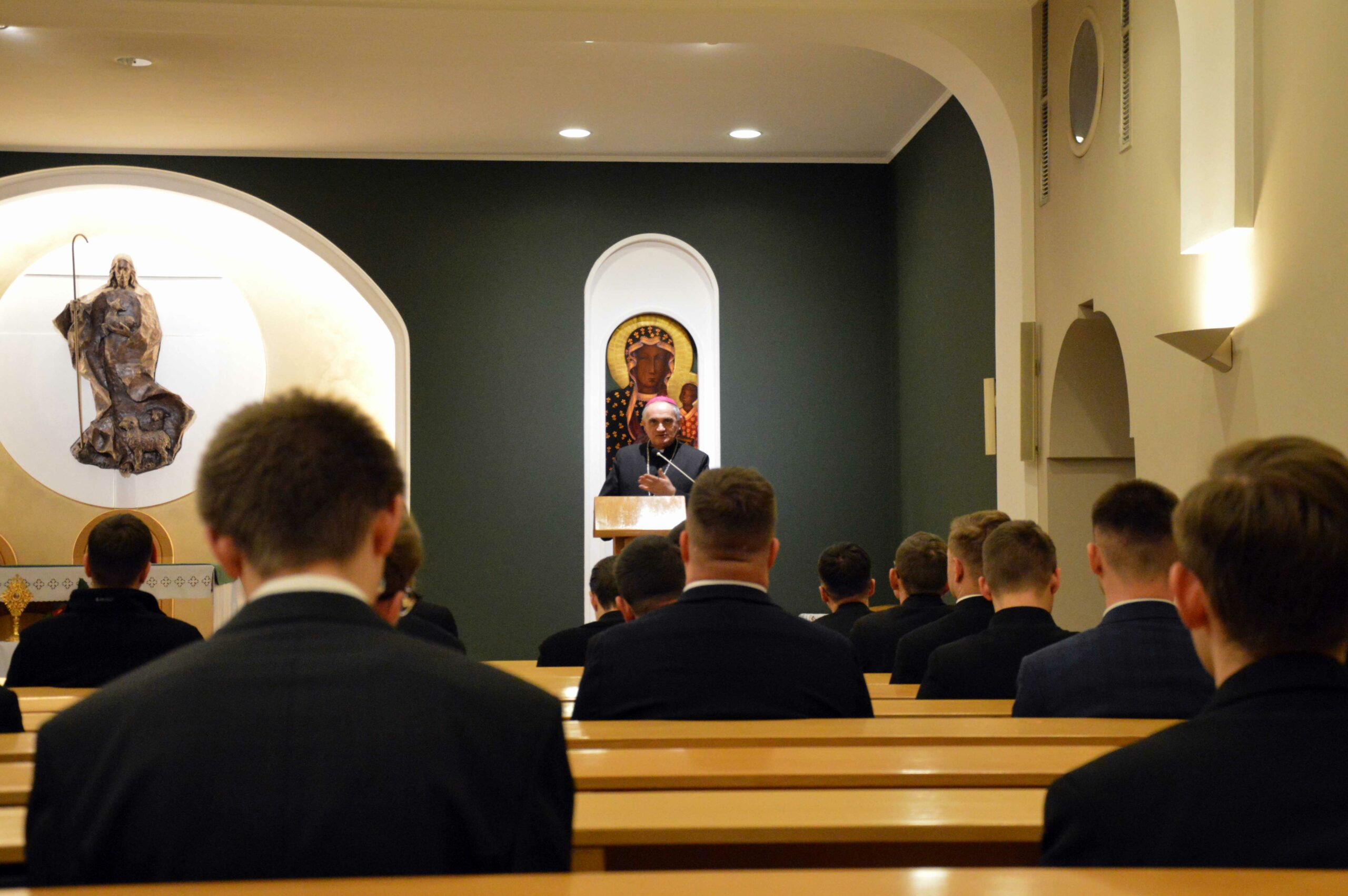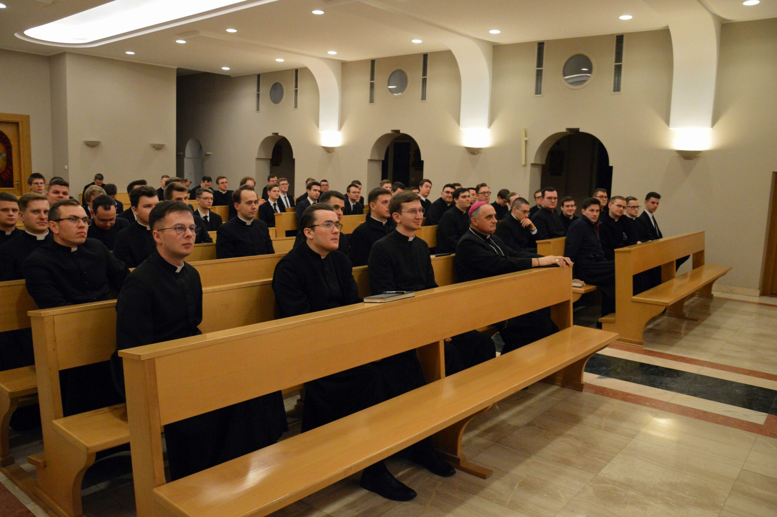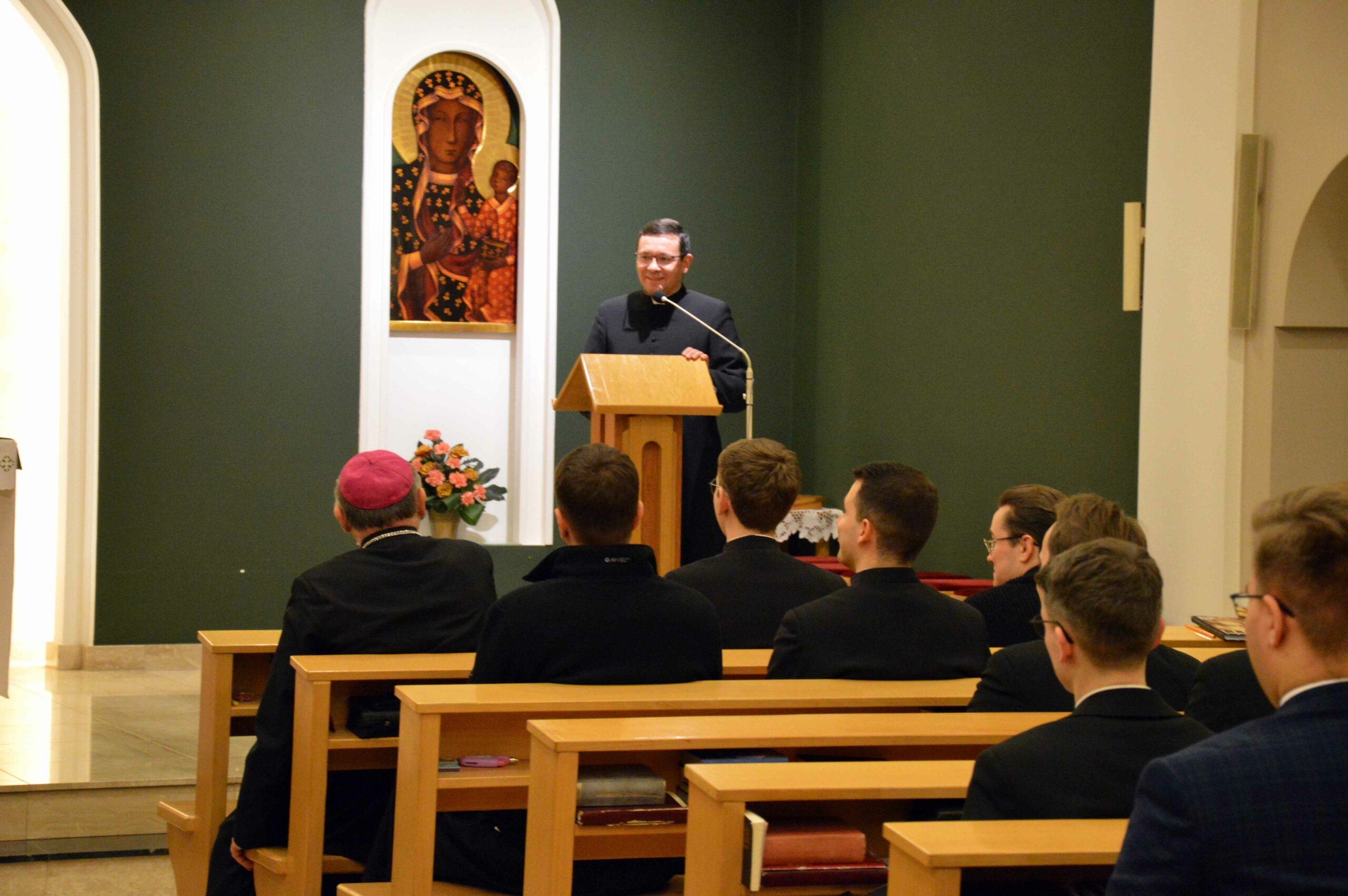 W środowy wieczór cała wspólnota spotkała się z biskupem bydgoskim Krzysztofem Włodarczykiem. Na początku, w seminaryjnej kaplicy pw. Chrystusa Dobrego Pasterza, ksiądz rektor Jan Frąckowiak przywitał biskupa Krzysztofa, dziękując mu za okazywaną wciąż życzliwość, pamięć modlitewną i zachowywanie wszystkich nas w pasterskim Sercu. Biskup bydgoski wygłosił naukę pt. „Kapłan dojrzałym mężczyzną”.